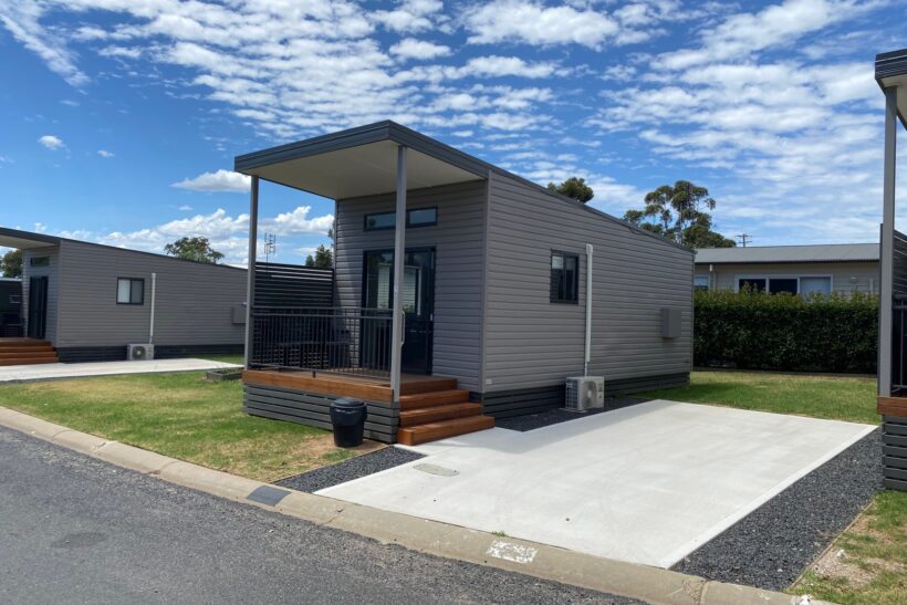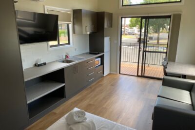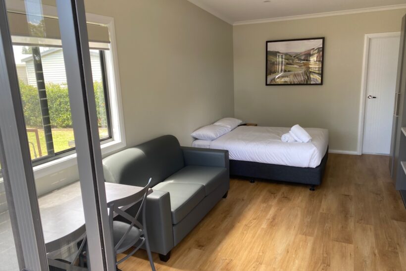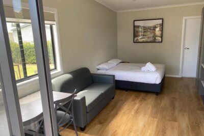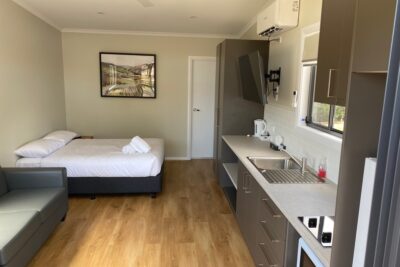 Our modern Deluxe Studios feature a double bed in the open plan living area, kitchenette with full sized fridge, cooktop and microwave, a small dining suite, sofa, separate ensuite at the rear and a private verandah with outdoor seating. These reverse cycle air-conditioned cabins are ideal for both singles and couples.